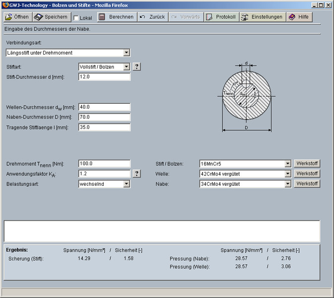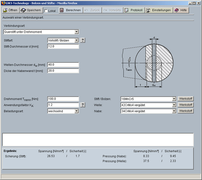 Alle Berechnungen erfolgen auf Basis anerkannter Fachliteratur, wie zum Beispiel nach Niemann und Decker. Weiterhin sind für die Berechnung verschiedene Stiftarten verfügbar. So kann zwischen Bolzen bzw. Vollstift, Kerbstift, Spannstift oder Spannhülse sowie Spiralspannstift gewählt werden.