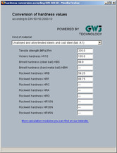 Using this module, it is possible to convert different hardness values into each other. The hardness values also can be determined by the input of the tensile strength. Different kind of materials can be selected for the calculation: