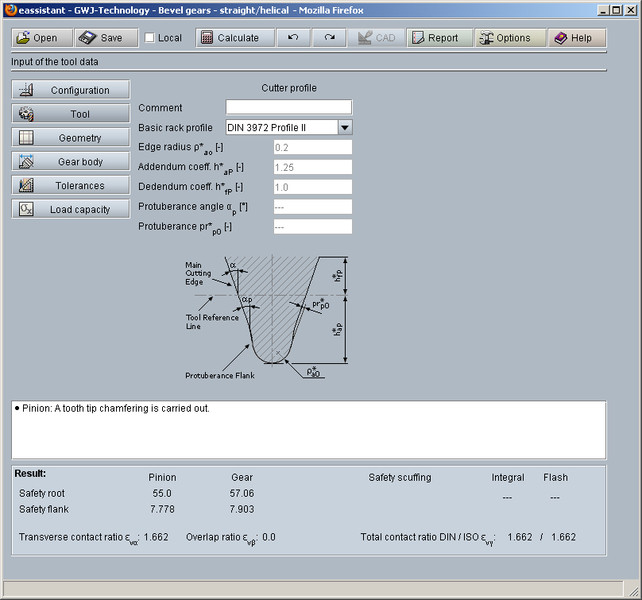 In addition to the geometry calculation, a calculation of the load capacity according to ISO 10300 Method B1 is possible. The user can calculate the safeties for fatigue or limited life strength and static strength (tooth root, flank / pitting, scuffing). Material and lubricant databases support the user. Additionally, the mode of operation is considered (swelling, alternating and oscillating).