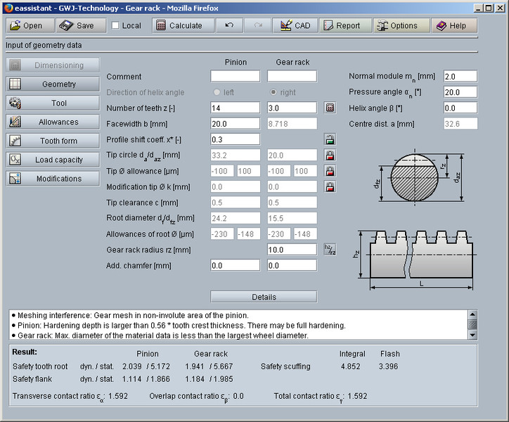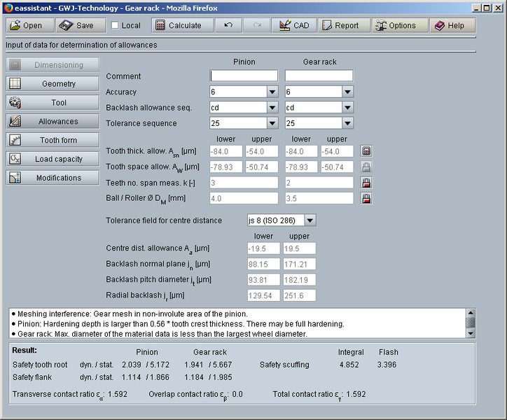 One particular highlight of the calculation module is the representation of the calculated gear tooth form with animation/simulation of the tooth mesh. For this representation, the minimum, mean and maximum allowances for the tooth thicknesses and tip diameters can be selected. The program also gives hints and warnings, for example in terms of gear tolerances which appear in the calculation report depending on the gear quality. A check for meshing interferences occurs in the background based on the accurate gear tooth form.