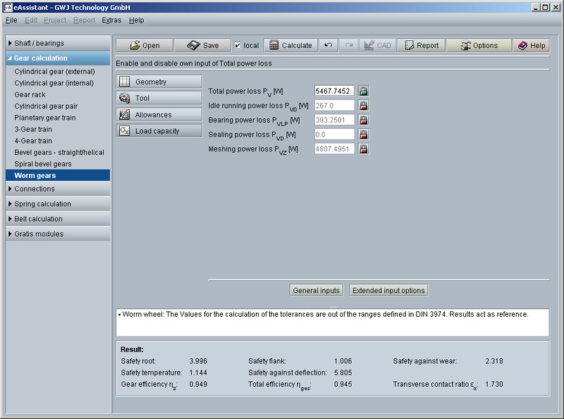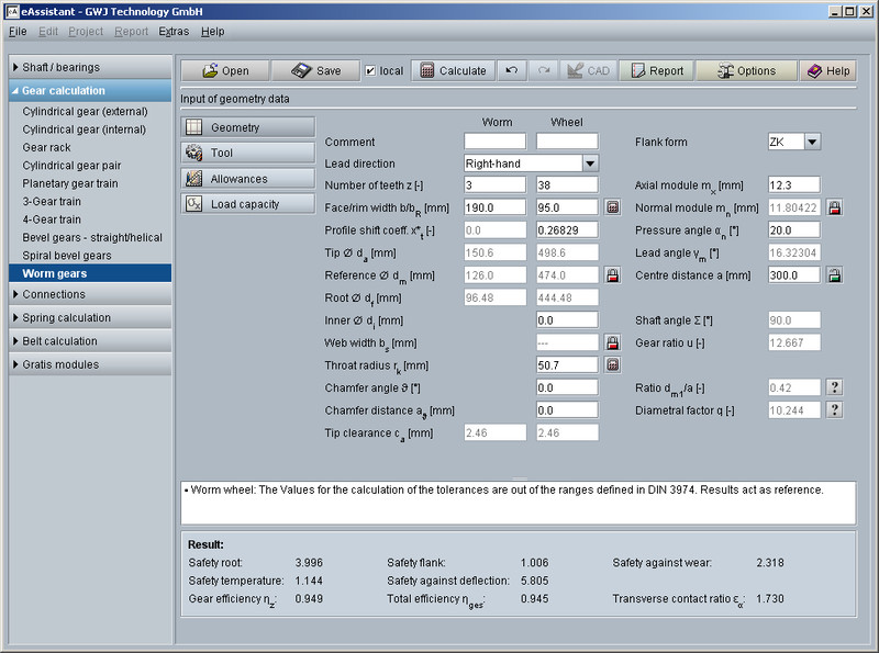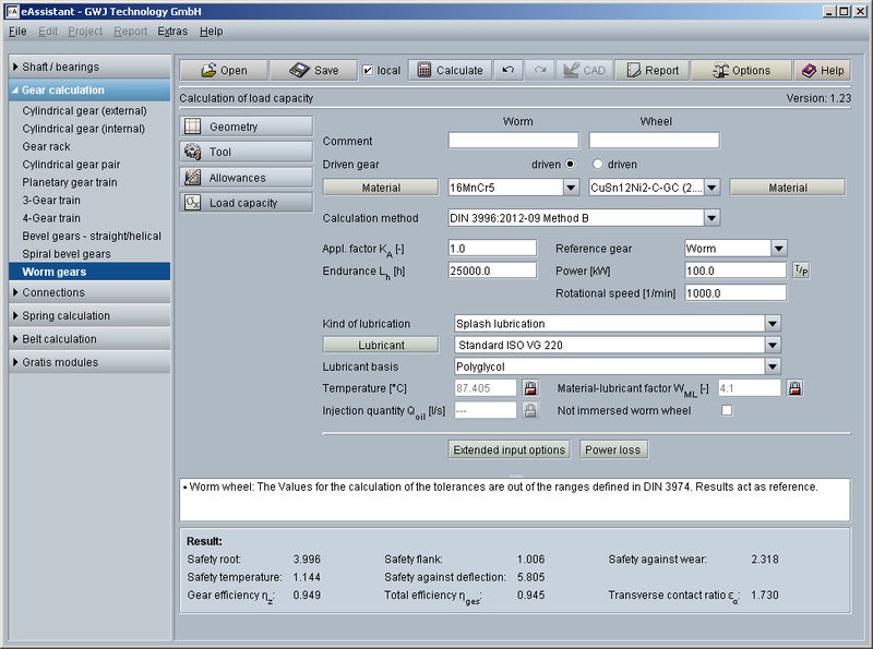 In addition to the geometry calculation, the load capacity calculation is also available, either according to DIN 3996 Method B, ISO/TR 14521 Method B or Niemann. The safeties for the tooth root and tooth flank (tooth break and pitting) are calculated and the temperature safety and safety against deflection and wear are also determined.