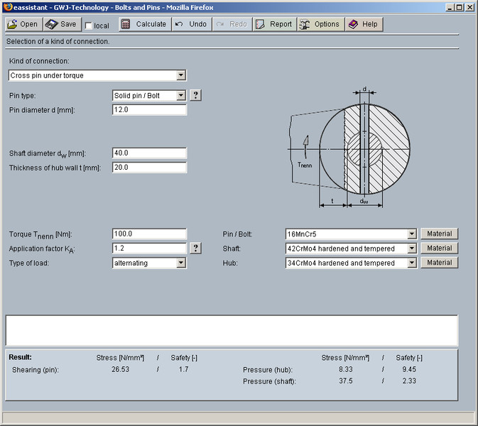 All calculations are based on generally accepted literature (e.g., Niemann and Decker). Futhermore, different pin types are available for the calculation: solid pin/bolt, grooved pin, (hollow) dowel pin as well as coiled spring pin.