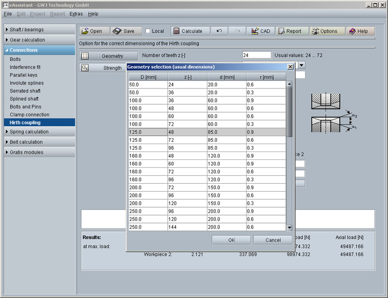 The calculation module can be used to determine the geometry and strength of Hirth couplings. By entering the number of teeth, outer and inner diameter, flank angle and tooth root radius, the geometry is automatically calculated. Various special cases of the connection are also supported.