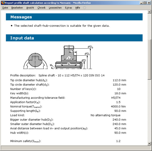 In the result overview the safeties and the pressures of the operation load and at the maximum load for the shaft and the hub will be displayed already during the input. After the calculation is finished, a calculation report can be generated for the documentation. This report includes the calculation method, the input values and detailed comprehensible results.