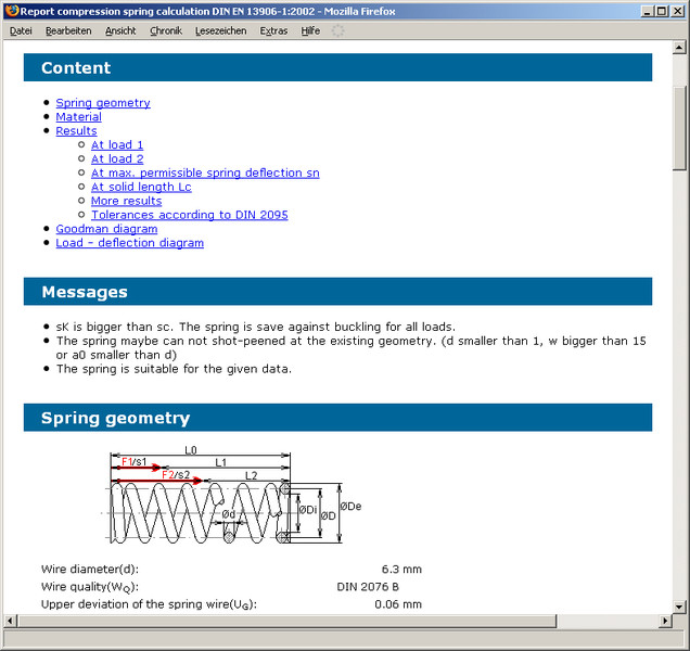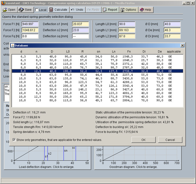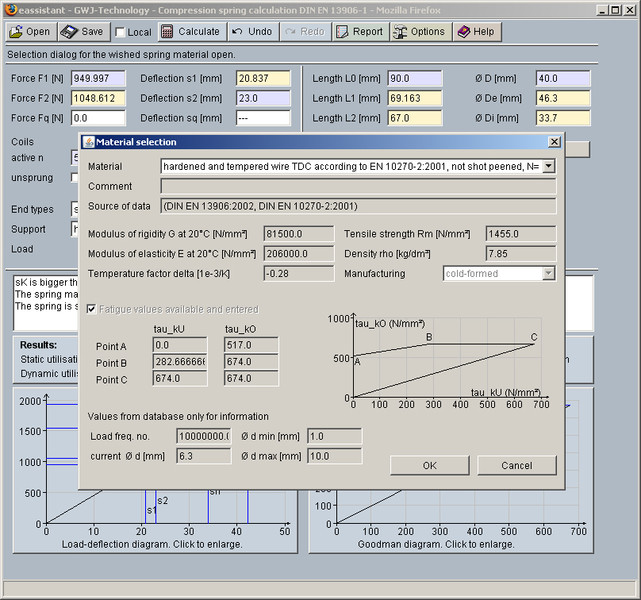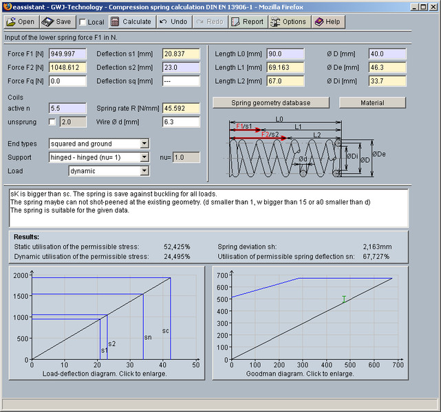 The important results, the static and dynamic utilisation of the permissible stress, the spring deviation and the utilisation of permissible spring deflection are displayed already during the input. Additionally, the Goodman and Load-deflection diagrams are available. A simple mouse-click allows to enlarge the diagrams.