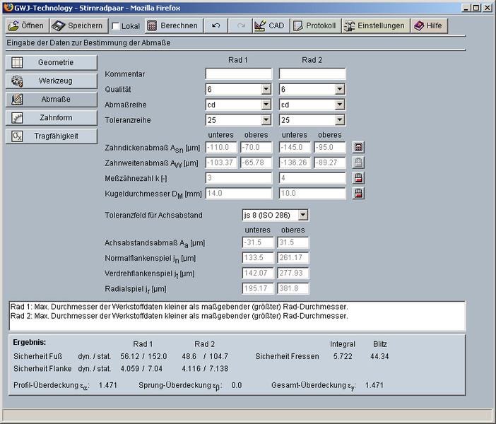 Este módulo le facilita el cálculo rápido de la geometría de pares de ruedas según las normas DIN 3960, DIN 3961, DIN 3964, DIN 3967, DIN 3977 y DIN 868. Se considerará en el cálculo el desplazamiento de perfil y las tolerancias. Se podrán escoger de las listas correspondientes, las tolerancias de grosor de dentado, la distancia entre ejes y los perfiles de referencia. Para el desplazamiento de perfil están a disposición del usuario las funciones de dimensionado para un deslizamiento específico equiparado. A su vez, se determinarán las medidas de prueba para el dentado y se calculará automáticamente la cantidad necesaria de dientes y el diámetro para el calibrado. Opcionalmente, el usuario podrá indicar estos valores.