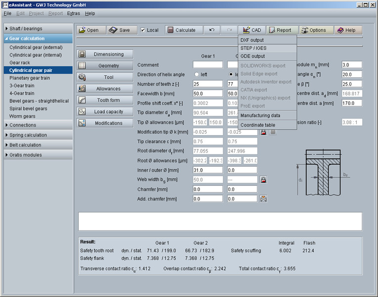 Currently the following calculation modules include the new STEP/IGES export feature: single cylindrical gears (external/internal), cylindrical gear pairs, planetary gear trains, three- and four-gear train systems, gear racks, straight, helical and spiral bevel gears as well as involute splines (DIN 5480 etc.).