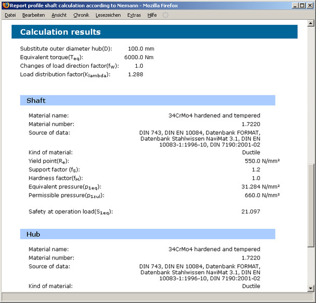Dans la liste des résultats, les sécurités et les pressions de la charge d'exploitation et de la charge maximale pour arbre et moyeu sont clairement affichées en cours de frappe. A la fin du calcul, l'utilisateur recoit pour information un protocole de calcul. Ce dernier contient les détails de la méthode de calcul, les données d'entrée et les résultats détaillés et compréhensibles. Il est disponible aux formats HTML et PDF.