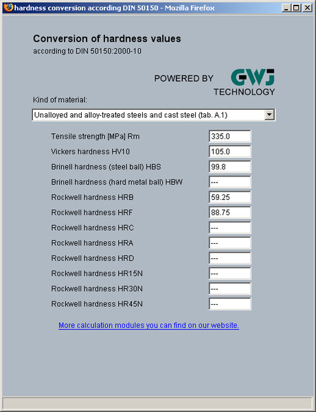 Avec ce module, les différentes valeurs de dureté peuvent être converties en une autre ou déterminées en définissant la résistance à la traction. Pour le calcul, différents types de matériaux peuvent être sélectionnés: