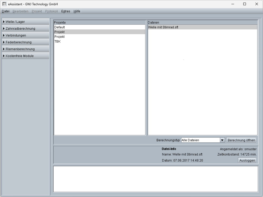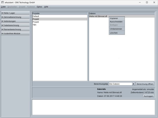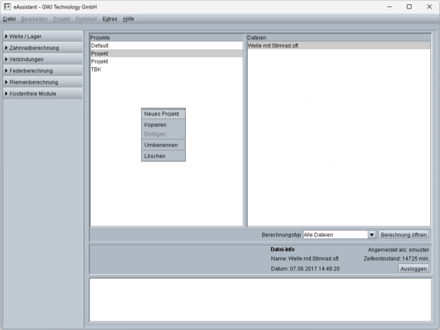 Der Projektmanager bildet die zentrale Schaltstelle des eAssistant. Von hier aus lassen sich die verschiedenen Berechnungsmodule starten, die übersichtlich in einer Baumstruktur zur Auswahl stehen. Durchgeführte Berechnungen werden Projekten zugeordnet und können so strukturiert verwaltet werden. Mithilfe der integrierten Filterfunktion lassen sich gespeicherte Berechnungen innerhalb eines Projekts sowohl modulübergreifend als auch modulspezifisch anzeigen. Projekte und/oder einzelne Berechnungen können kopiert, umbenannt oder gelöscht werden.