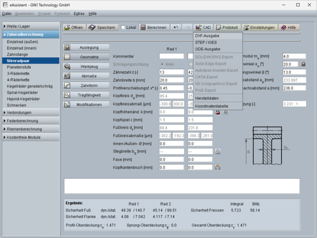 Für evolventischen Zahnformen ist die Ausgabe im 2D-DXF-Format mit verschiedenen Einstelloptionen möglich. Die DXF-Ausgabe steht für Einzelstirnräder (außen/innen), Stirnradpaare, Planetenstufen, 3er- und 4er-Räderkette, Zahnstange-Ritzel und Zahnwellenverbindungen zur Verfügung.