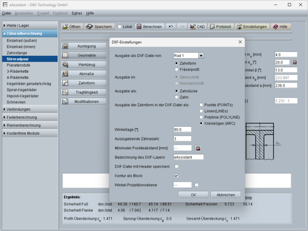 - Ausgabe exakter Zahnformgeometrien beliebiger evolventischer Verzahnungen im 2D-DXF-Format