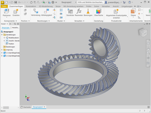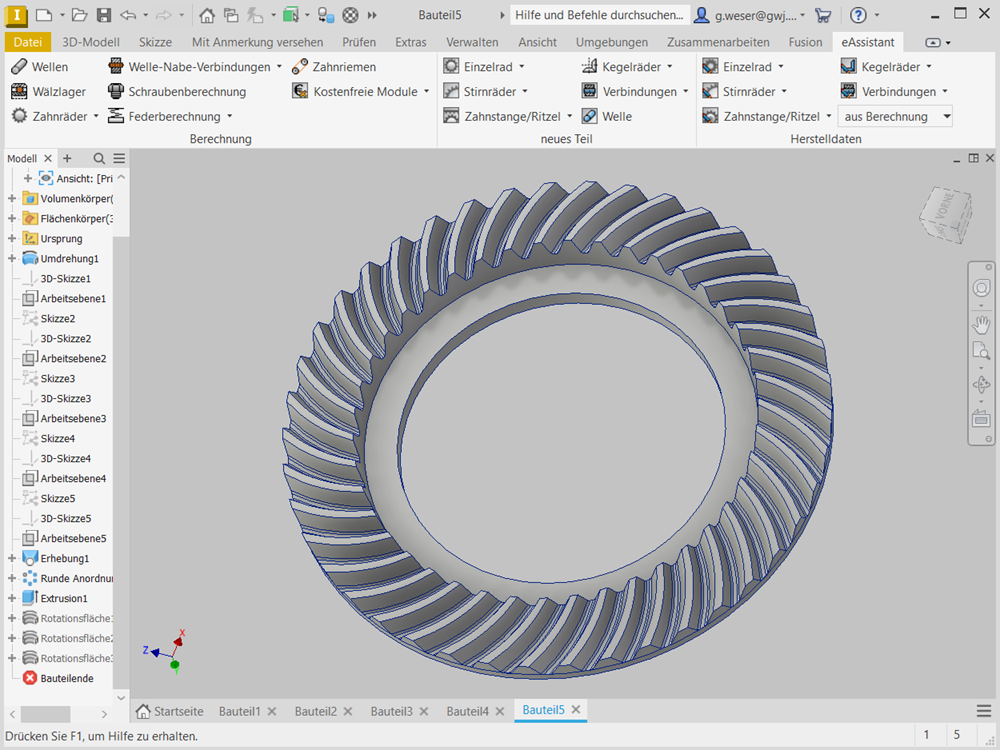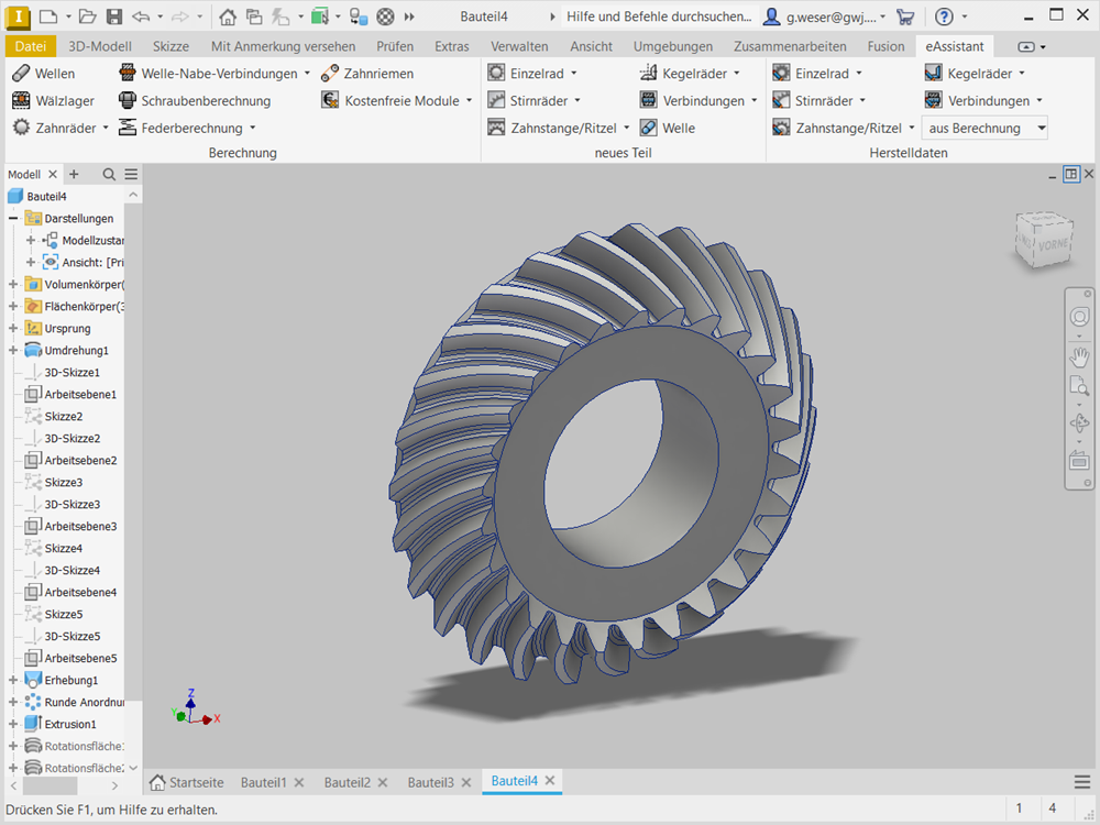 Weiterhin können auf Basis der Berechnung gerad-, schräg- und spiralverzahnte Kegelräder automatisch direkt als 3D-Autodesk Inventor-Teil generiert werden.