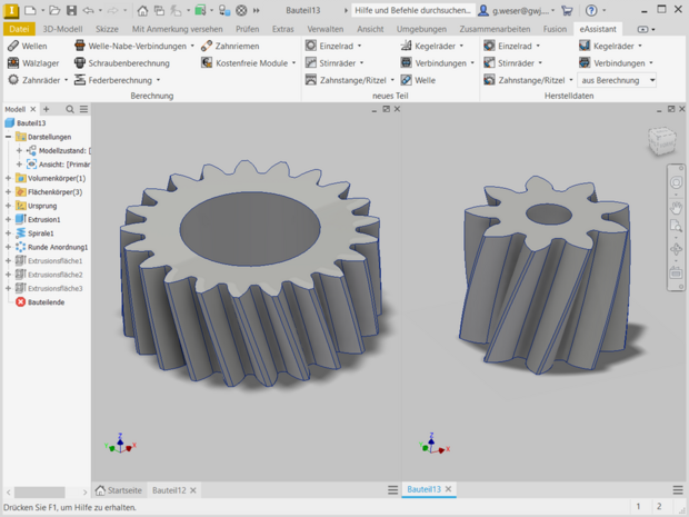 Das CAD-PlugIn realisiert zusätzlich eine bidirektionale Kopplung zwischen dem eAssistant und Autodesk Inventor. Sind nach der Berechnung und Erzeugung des 3D-Modells Änderungen erforderlich, kann das Modell mühelos an die modifizierte Berechnung angepasst werden. Diese Funktionalität steht für außen- und innenverzahnte Gerad- und Schrägstirnräder, für evolventische Zahnwellenprofile und für Hohl- und Vollwellen jeweils als Einzelteile zur Verfügung. Somit lassen sich Konstruktionen während des Entwicklungsprozesses schnell und einfach auf Knopfdruck aktualisieren.
