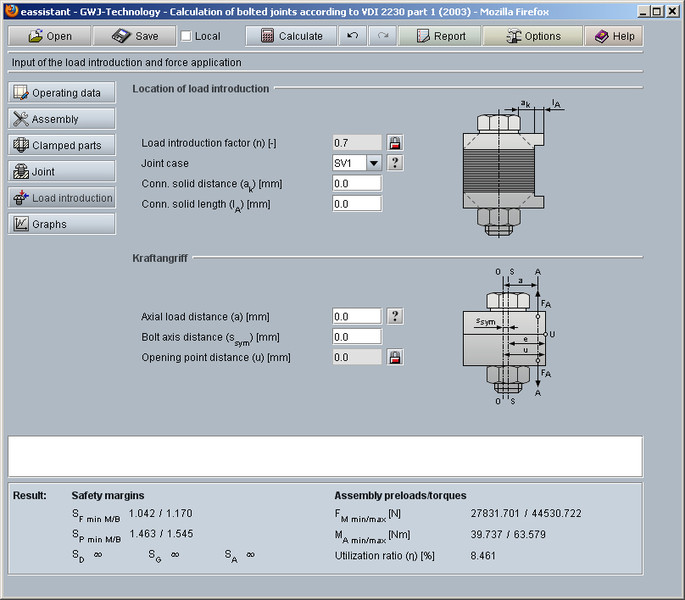 The user can choose clamped parts and can define the basic solid geometry, the load introduction and force application. Both centric and eccentric tensions are supported. The calculation module proposes a nominal diameter. Illustrations help to better understand the geometry. A suggestion function is also available for selecting the nominal bolt diameter.
