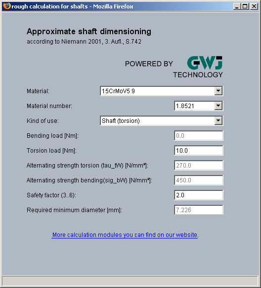 After the input of the loads (bending load, torsion load or both) and the desired safety factor, the required minimum diameter will be calculated.
