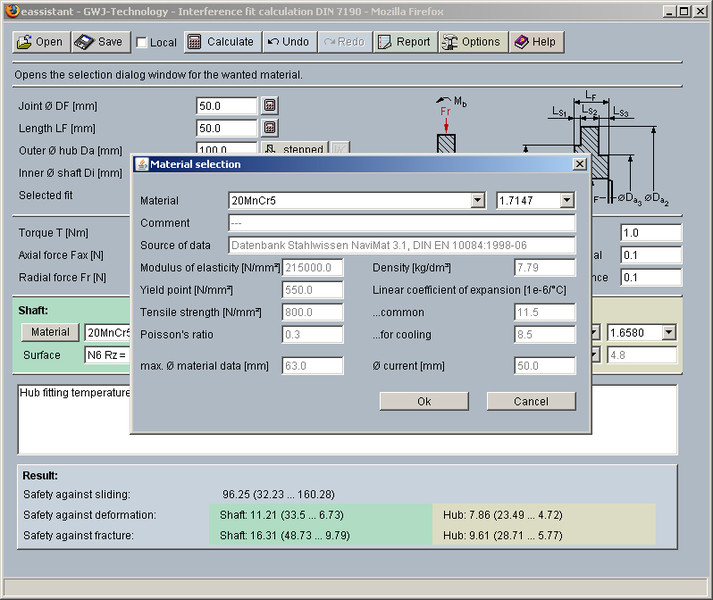 Materials and surface quality for the shaft and hub can be comfortably selected from the database. An own or user defined input is also possible for these values. The results are displayed for mean (minimum .. maximum) interference. In case one of the given minimum safety is not fulfilled, the safety will then be marked in red.