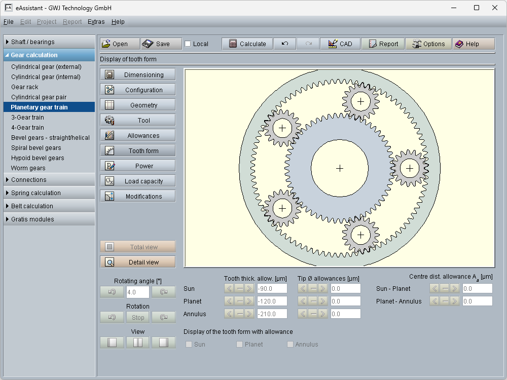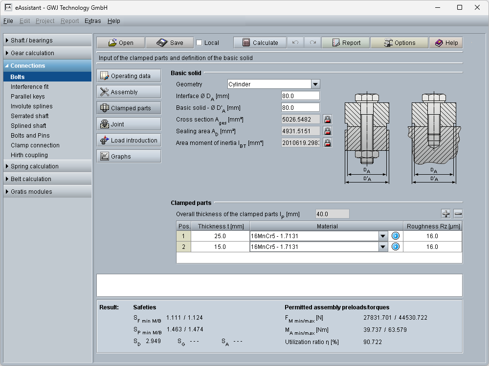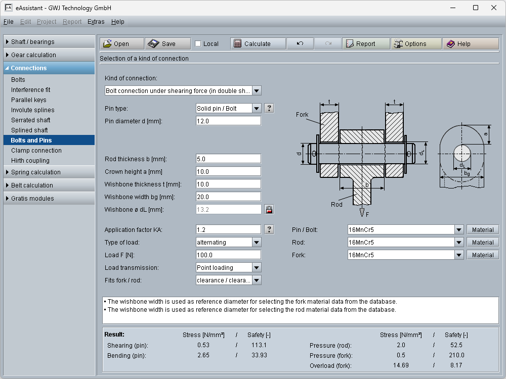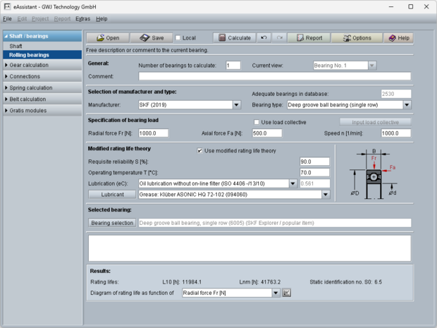 The recognized calculation methods are implemented comprehensively and in a practical manner. An example is the shaft strength calculation according to the latest version of DIN 743. The calculation modules are characterized by easy operation and convenient design functions. A particular highlight is the interactive graphics in the shaft calculation module, where the shaft geometry can be constructed together with the different force elements and bearings. Users can easily select standard values from the provided material or geometry databases, ensuring optimal support throughout the design process.