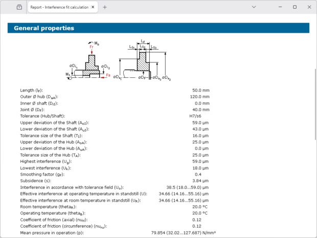 For the assembling and disassembling, the results of the mating temperature and of the required forces for pressing in and out are presented in the report. The mating clearance is definable as constant or against the joint diameter. Further, the user can define temperatures and coefficients of friction for the mating individually.