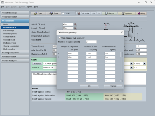 The calculation module allows for the calculation of force and shrink fits. The calculation includes cylindrical interference fits according to DIN 7190 (only elastic range) with the extension of centrifugal force based on Kollmann (Konstruktion 33 H.6). Additional external loads (radial force and bending moment) can be considered in the calculation. This calculation method is based on Prof. Dr.-Ing. H. Gropp, TU Chemnitz 1997. Further, the calculation with stepped geometry of the hub outer diameter is also supported and based on Prof. Hartmann: Berechnung und Auslegung elastischer Pressverbindungen. The calculation will be carried out with a segmentation of the interference fit length.