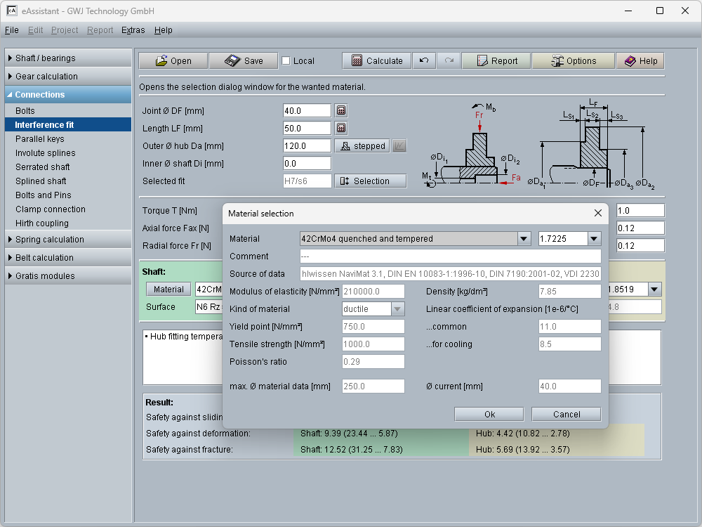 Materials and surface quality for the shaft and hub can be comfortably selected from the database. An own or user defined input is also possible for these values. The results are displayed for mean (minimum .. maximum) interference. In case one of the given minimum safety is not fulfilled, the safety will then be marked in red.