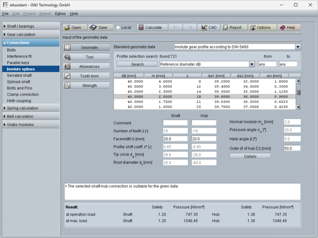 The module allows a fast and easy calculation of the geometry and strength of involute splines according to DIN 5480 (03/2006), DIN 5482 (03/1973), ISO 4156 (10/2005), ANSI B92.2M-1980 (R1989) and ANSI B92.1-1996. The geometry can be selected conveniently from a data base. The profile search function can help the user to quickly identify a profile. An own input of involute spline geometry is also possible.