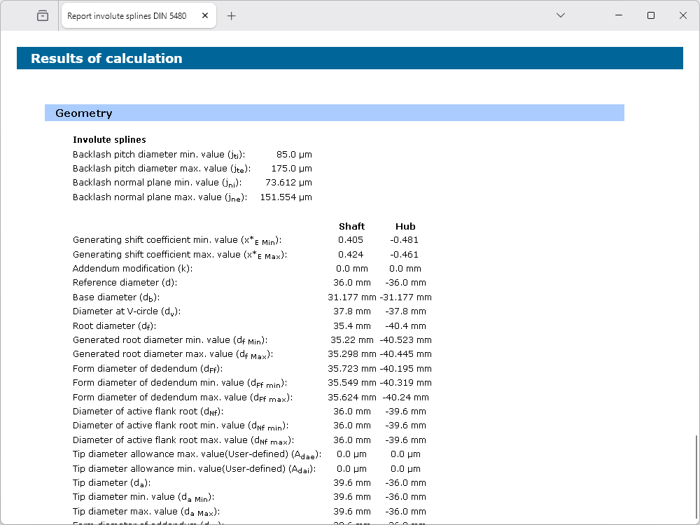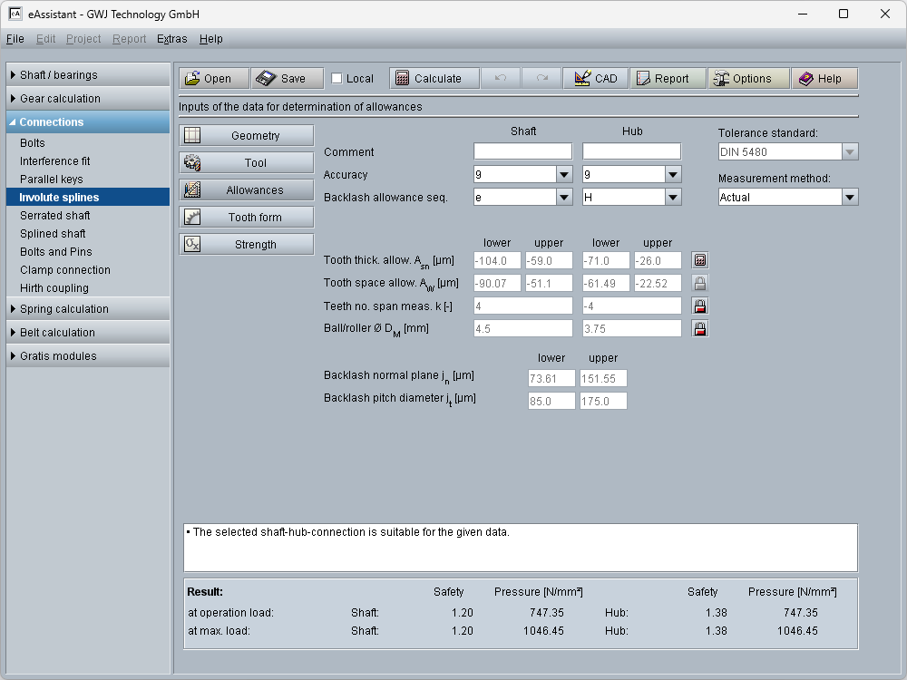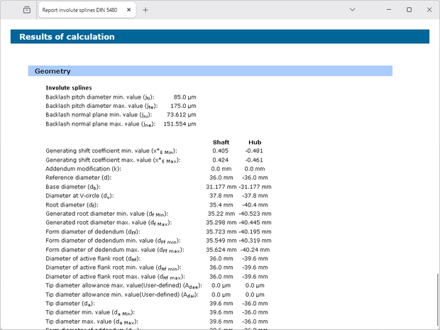 In order to determine the tolerances, the gear accuracy and backlash allowance sequence according to DIN 5480, DIN 5482, ANSI B92.2 and ANSI B92.1 can be selected from listboxes. This will determine the permissible deviations and tooth thickness allowances. The calculation of the tooth thickness allowances can be done based on measured values or given test dimensions. Test dimensions, backlash normal plane and backlash pitch diameter are calculated as well. For the test dimensions, the required number of the teeth for span measurement and the diameter of ball or pin will be determined automatically by the program or can be entered by the user.