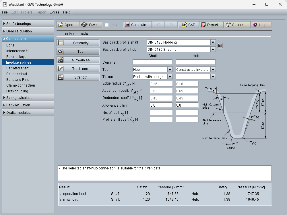 The following tool types are available: hob, gear shaper cutter and constructed involute. Basic rack tooth profiles can be selected according to DIN 5480 for broaching, hobbing, shaping, cold rolling and diameter centering. Tool standard rack tooth profiles for the other standards are also available, e.g., for ISO 4156 30° flat root or 30° fillet root. All parameters for the basic rack tooth profile can be defined individually or determined automatically.