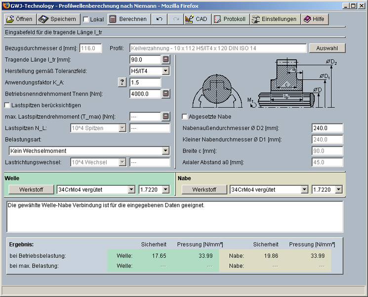 El cálculo de resistencia para los acoplamientos de ejes acanalados según Niemann “Elementos de máquinas” Tomo 1, Edición 2001. se realizará según las normas DIN ISO 14 (para cargas ligeras y medianas), DIN 5464, DIN 5471 y DIN 5472. Las dimensiones pueden ser seleccionadas directamente desde nuestra base de datos o identificadas por medio de la búsqueda de perfil. Adicionalmente se pueden ingresar perfiles que no estén estipulados en la norma.