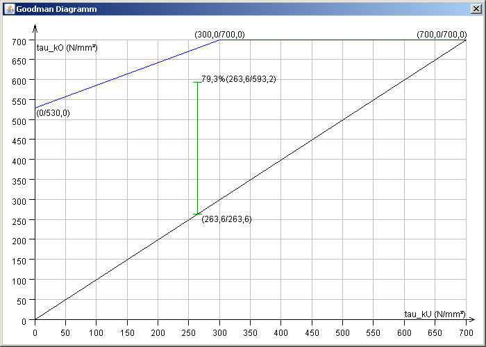 Los resultados más importantes, es decir, el aprovechamiento estático y dinámico de la tensión admitida, la trayectoria de suspensión y el aprovechamiento de la trayectoria total del muelle se mostrarán claramente durante el ingreso de los datos. Adicionalmente se efectuará la representación de los diagramas de Goodman y de fuerza-trayectoria. Para maximizar el diagrama haga un clic sobre el diagrama correspondiente.