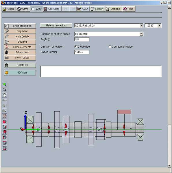 En plus de l'entrée directe des forces et des couples, des éléments de force intelligents peuvent aussi être utilisés, tels que les engrenages, les masses supplémentaires ou l'embrayage/le moteur. Pour le calcul de capacité de charge selon la norme DIN 743, tous les types des effets de concentration de tension de la norme peuvent être définis. En outre, l'effet de concentration de tension „arbre lisse“ est introduit dans le calcul afin, par exemple, d'effectuer une validation du calcul de capacité de charge dans une pièce d'arbre lisse très chargée. En plus des entrées de géométrie en deux dimensions, une vue en 3D est disponible.