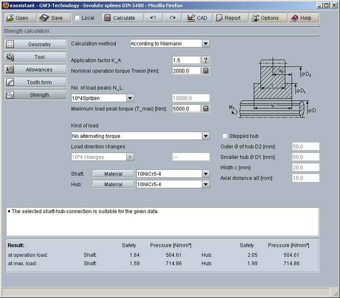 Les pressions autorisées sont déterminées en fonction des propriétés des matériaux, de sorte qu'il est possible d'utiliser des matériaux particuliers. Les matériaux existants peuvent être sélectionnés facilement à partir de la base de données des matériaux intégrée dans le module. Pour les différentes charges d'entrée et les rendements, le facteur de répartition de charge sera calculé par analogie sur la base des caractéristiques géométriques de l'utilisateur selon la norme DIN 6892. De plus, le nombre de charges maximales et la nature du moment du couple alternatif existant peuvent être spécifiés pour le calcul.