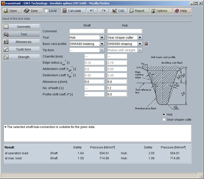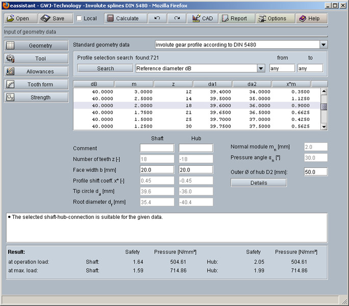 Le module de cannelures à flancs développants permet le calcul de capacité de charge des liaisons arbre-moyeu avec les profils en développants selon la norme DIN 5480. Le calcul s'effectue selon Niemann „Maschinenelemente“ Tome 1, Edition 2001. Les dimensions peuvent être facilement sélectionnées à partir de la base de données ou peuvent être rapidement identifiées via la fonction de recherche d'un profil. En outre, des profils différents peuvent être entrés pour le calcul selon la norme.