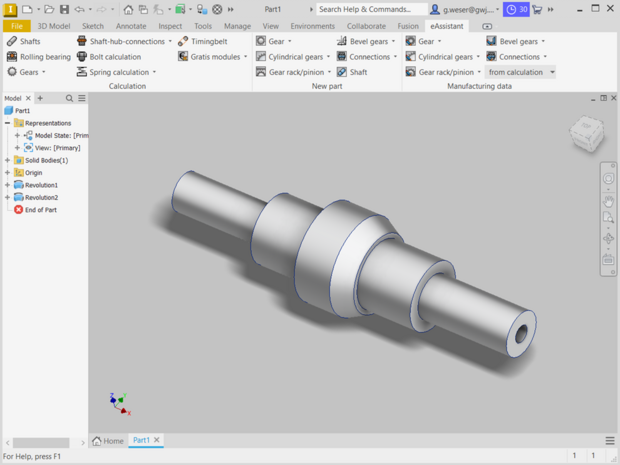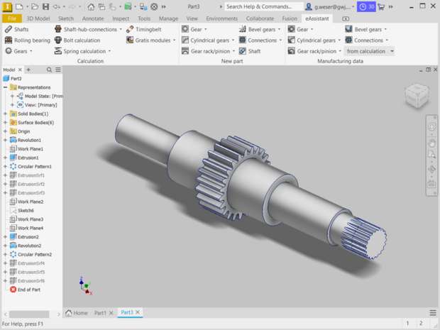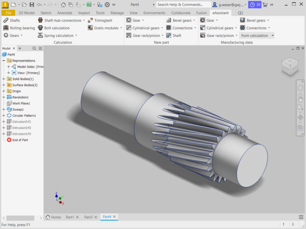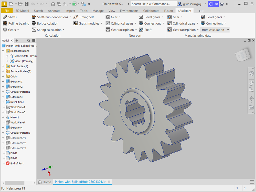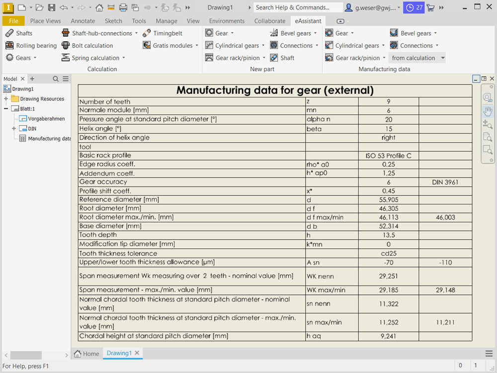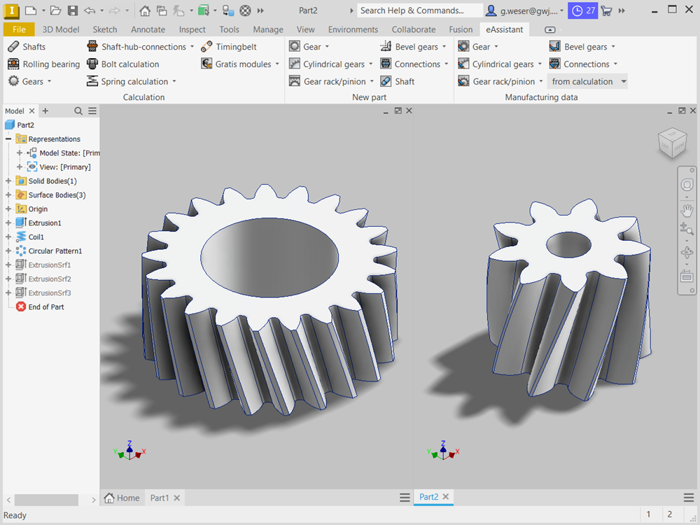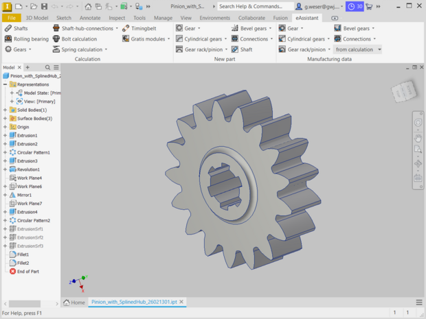 À partir du module de calcul de l'eAssistant pour engrenages cylindriques, les engrenages cylindriques et hélicoïdaux peuvent être élaborés automatiquement en 3D. Tolérances, chanfrein de tête, déport et perçage d'arbres seront pris en compte dans le calcul et la modélisation d'une forme de dent exacte.