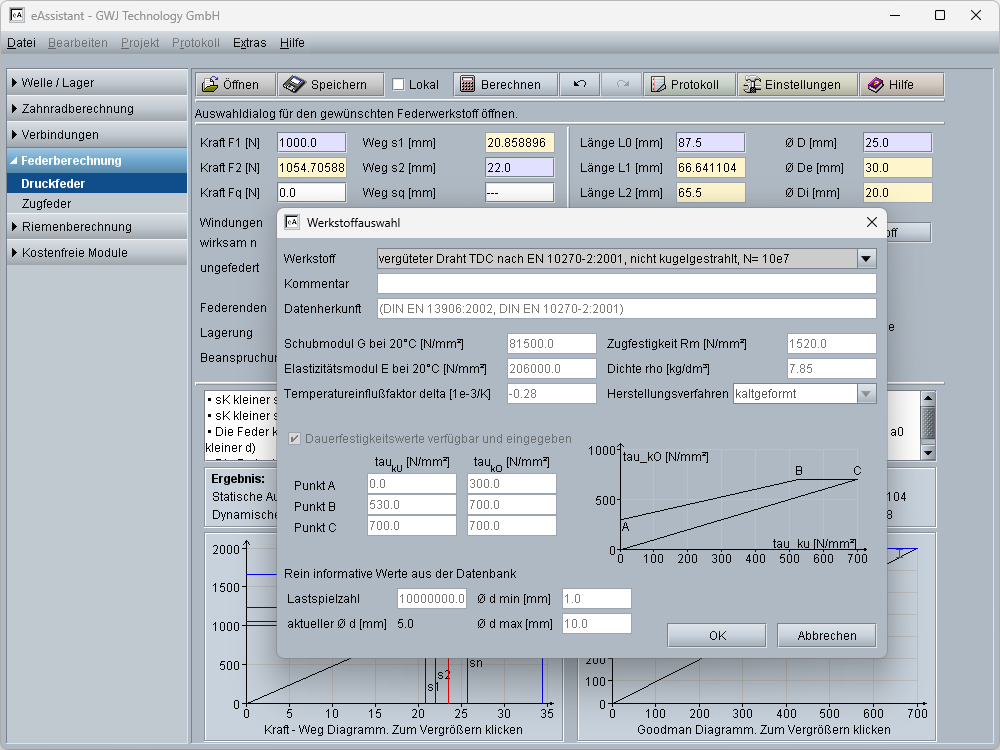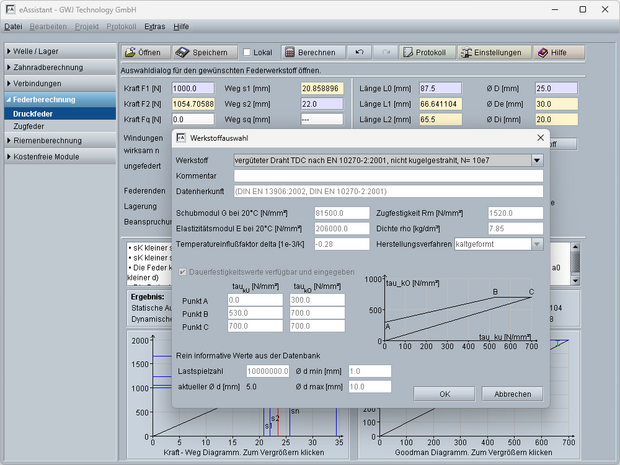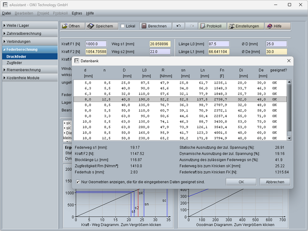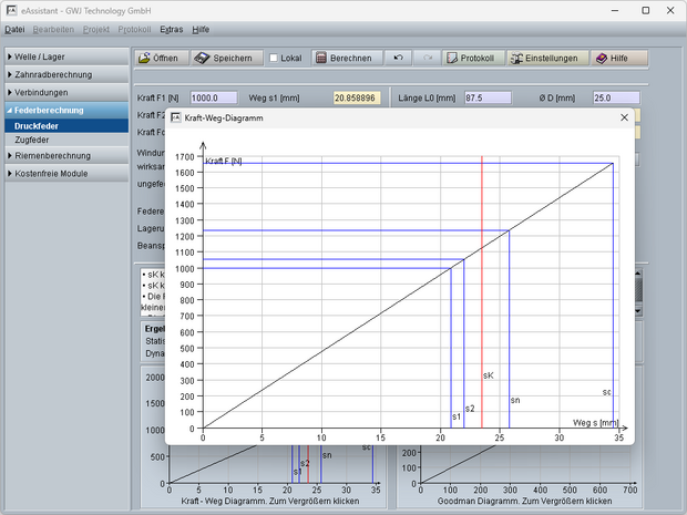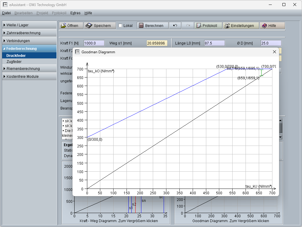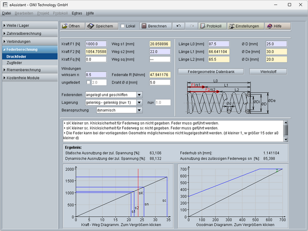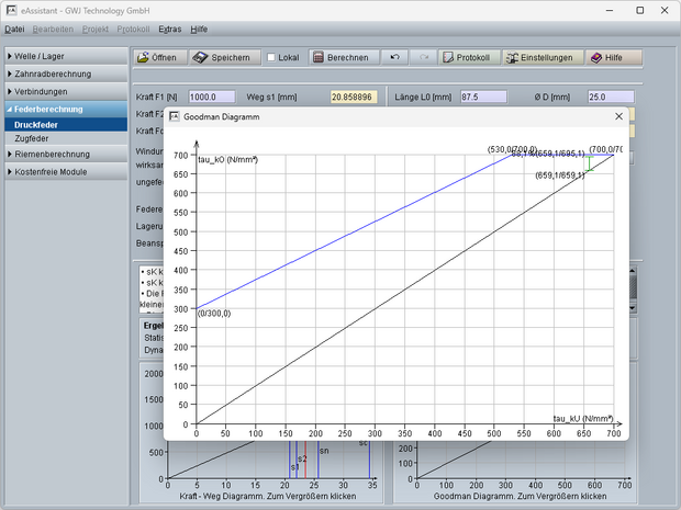 Die wichtigsten Ergebnisse, d. h. die statische und dynamische Ausnutzung der zulässigen Spannung, der Federhub und die Ausnutzung des zulässigen Federweges werden bereits während der Eingabe übersichtlich angezeigt. Zusätzlich erfolgt die Darstellung des Goodman- und des Kraft-Weg-Diagramms. Die Diagramme lassen sich per Mausklick vergrößert darstellen.
