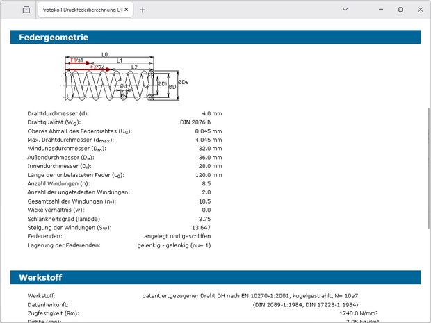 - Geometriegrößen, wie Längen, Durchmesser und Windungen stehen gemäß DIN 2098 zur Auswahl oder können manuell eingegeben werden