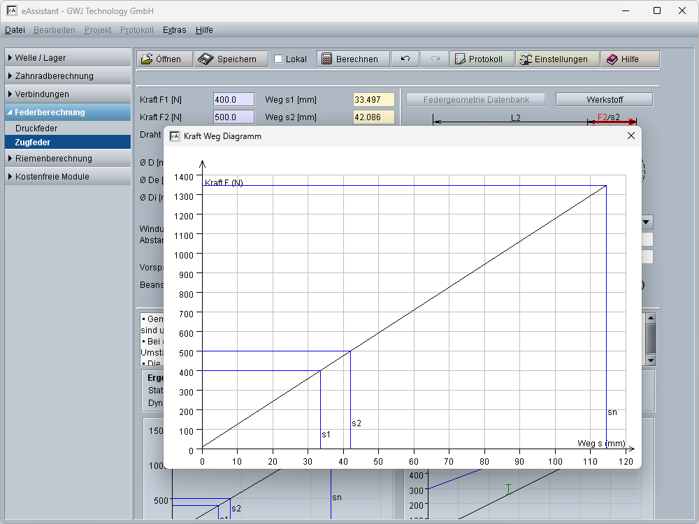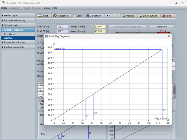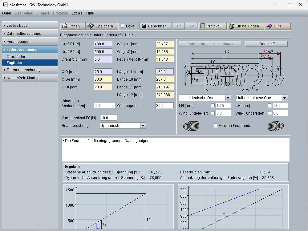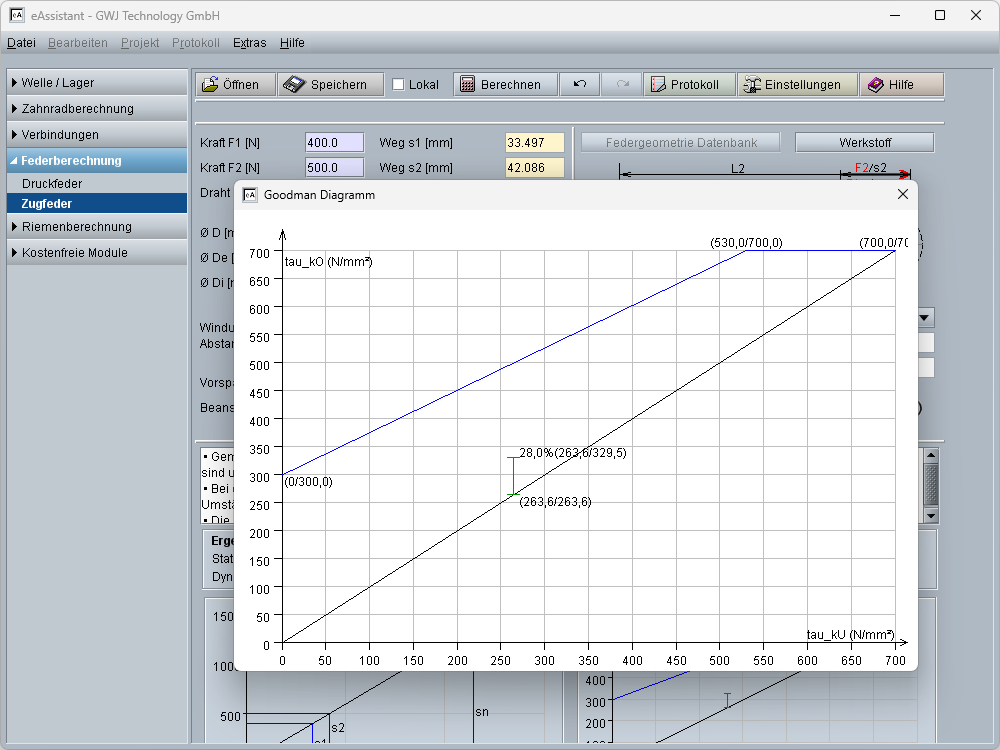 Die wichtigsten Ergebnisse, d. h. die statische und dynamische Ausnutzung der zulässigen Spannung, der Federhub und die Ausnutzung des zulässigen Federweges werden bereits während der Eingabe übersichtlich angezeigt. Zusätzlich erfolgt die Darstellung des Goodman- und des Kraft-Weg Diagramms. Die Diagramme lassen sich per Mausklick vergrößert darstellen.