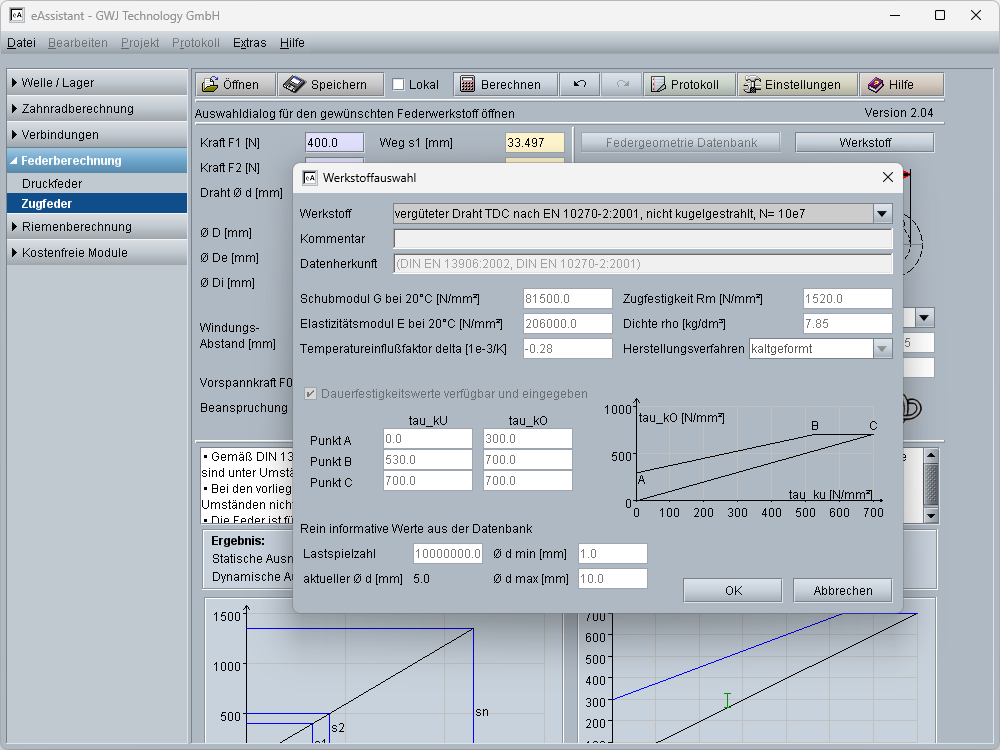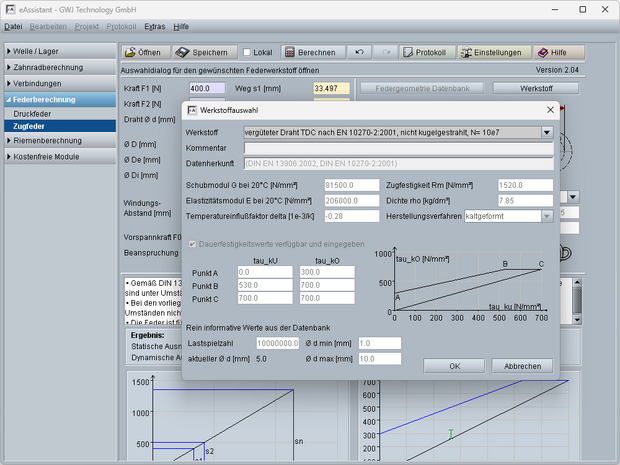 - Federwerkstoffe aus Datenbank wählbar oder individuelle Definition