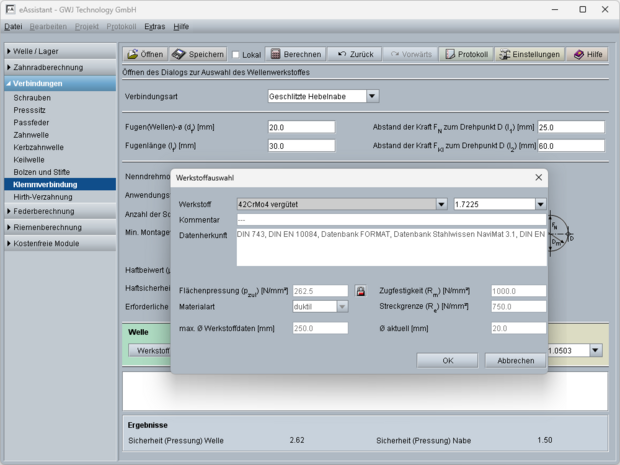 - Ermittlung der zulässigen Pressungen aus Werkstoffkennwerten oder individuelle Eingabe