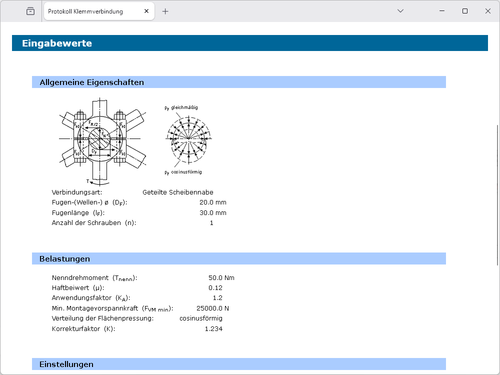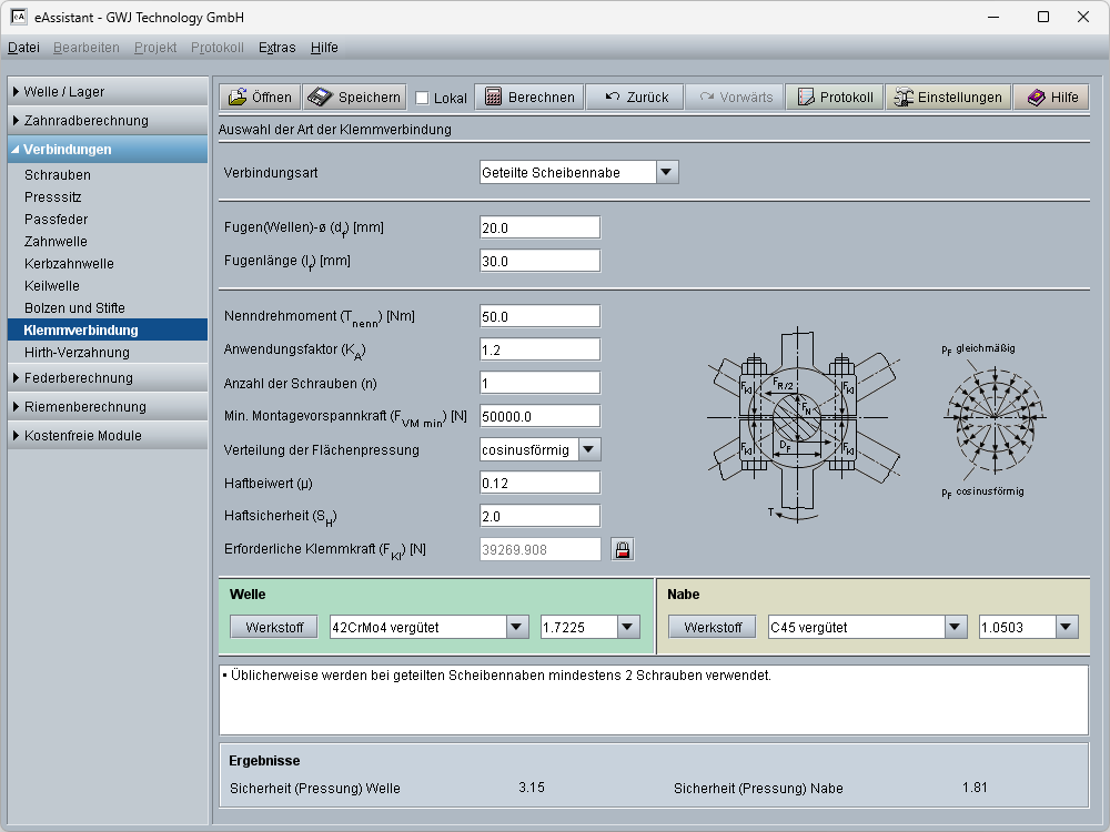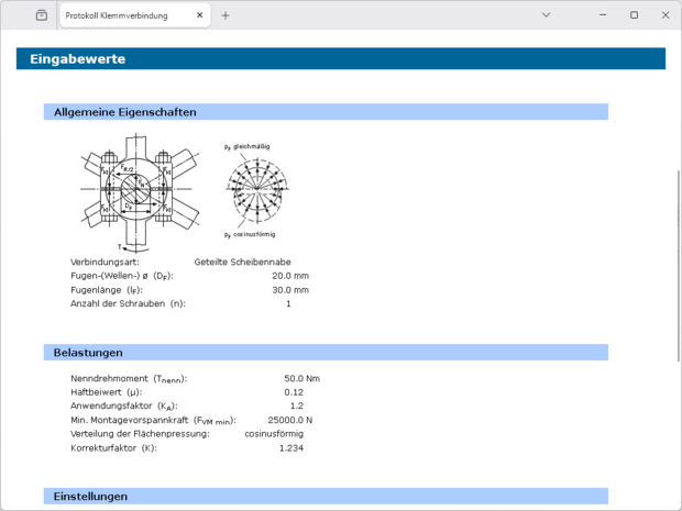 Mit der Vorgabe der Geometrie, des Drehmomentes und der Schraubenanzahl wird bei vorgegebener Haftsicherheit und Haftbeiwert die notwendige Klemmkraft berechnet. Weiterhin wird geprüft, ob die Montagevorspannkraft ausreichend ist. Weiterhin wird die Sicherheit bezüglich Flächenpressung für Welle und Nabe ermittelt.