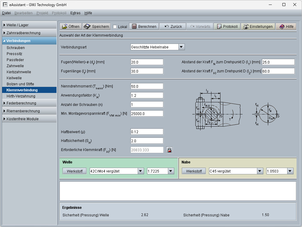 Das Modul Klemmverbindungen ermöglicht die Auslegung und Nachrechnung von Scheibennaben als auch von Hebelnaben. Die Berechnung basiert auf Roloff/Matek Maschinenelemente (17. überarbeitete Auflage 2005).