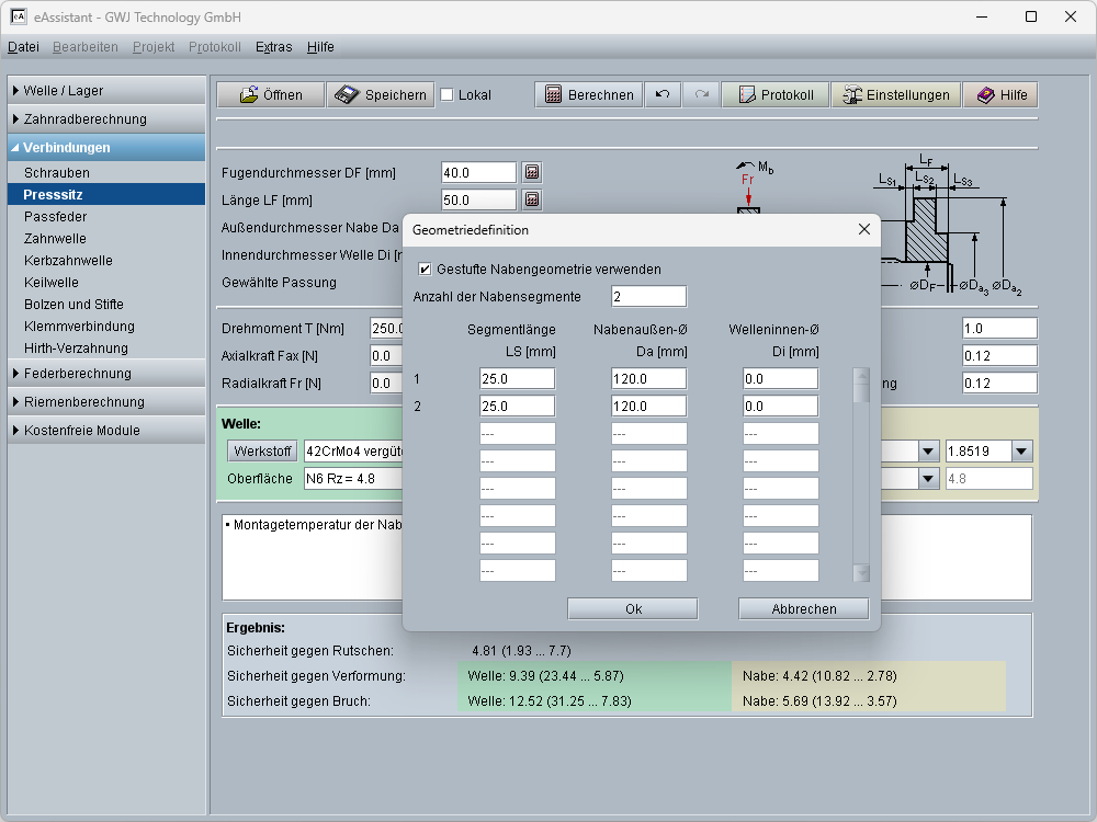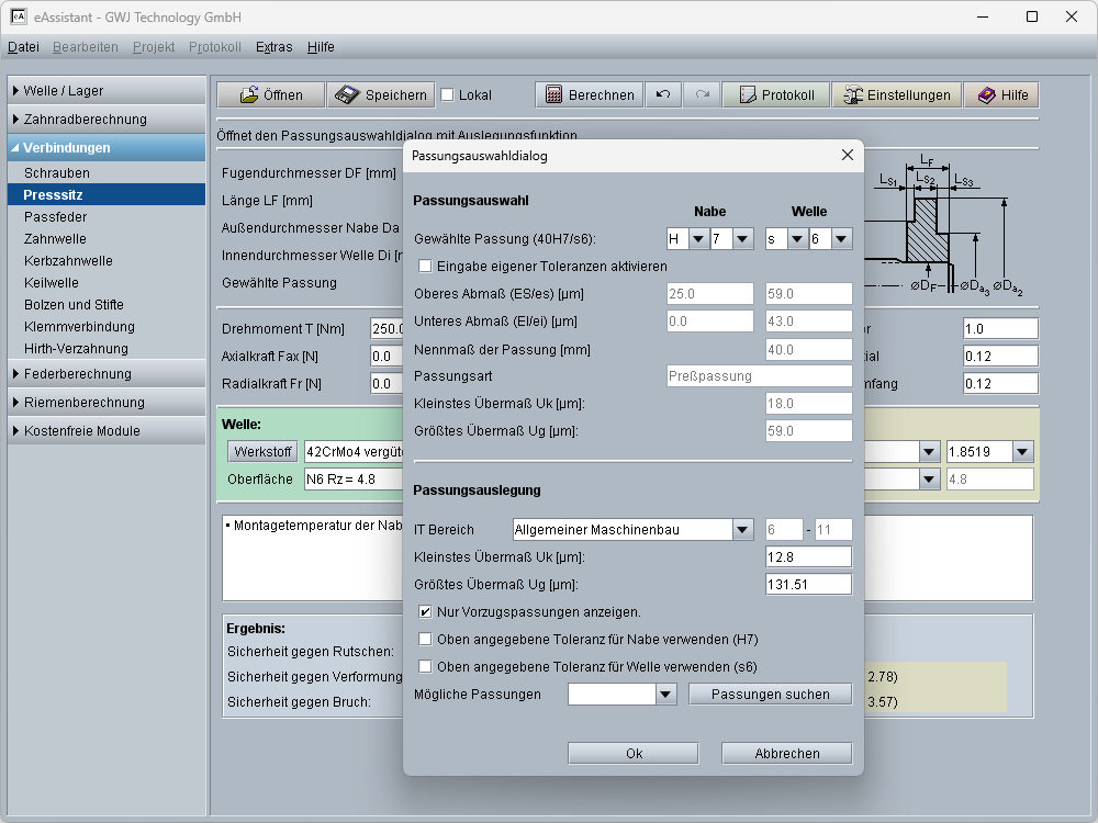 - Auslegungsfunktionen für Presssitzlänge, Drehmoment etc.