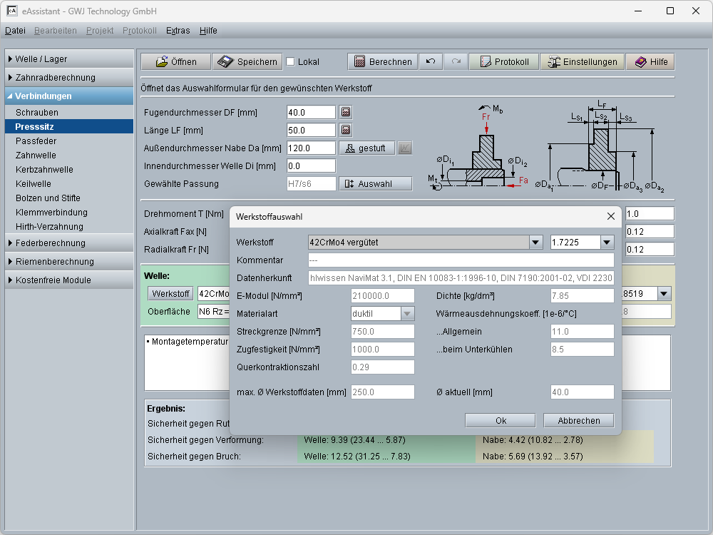 Werkstoffe und Oberflächenrauhigkeiten können jeweils für Welle und Nabe bequem aus der zur Verfügung stehenden Datenbank ausgewählt oder individuell vorgegeben werden. Die Angabe der Ergebnisse erfolgt jeweils für das mittlere, kleinste und größte Übermaß der Presspassung. Wird eine der vorgegebenen Sicherheiten unterschritten, so wird diese rot markiert.