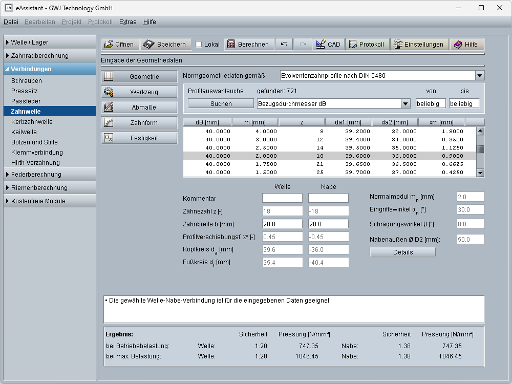 Das Modul Zahnwelle erlaubt die schnelle und einfache Berechnung der Geometrie und Festigkeit von Passverzahnungen mit Evolventenzahnprofilen nach DIN 5480 (03/2006), DIN 5482 (03/1973), ISO 4156 (10/2005), ANSI B92.2M-1980 (R1989) und ANSI B92.1-1996. Die Abmessungen können bequem aus einer Datenbank ausgewählt oder über die Profilsuche schnell identifiziert werden. Darüber hinaus können auch von der Norm abweichende Profile für die Berechnung vorgegeben werden.