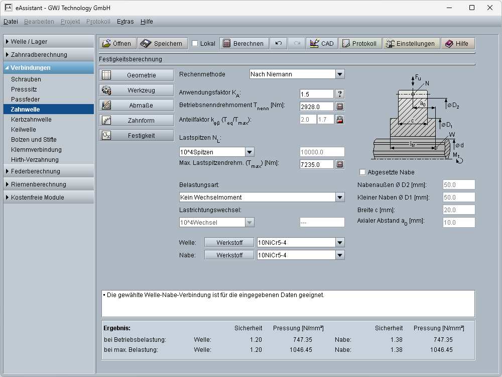Die Festigkeitsberechnung erfolgt nach Niemann „Maschinenelemente“ Band 1, Ausgabe 2001. Die zulässigen Pressungen werden dabei aus den Werkstoffeigenschaften ermittelt, so dass die Möglichkeit des Einsatzes von Sonderwerkstoffen besteht. Vorhandene Werkstoffe können auf einfache Weise aus der integrierten Werkstoffdatenbank ausgewählt werden. Für unterschiedliche Lastein- bzw. ableitungen wird der Lastverteilungsfaktor auf der Basis geometrischer Vorgaben des Anwenders analog der DIN 6892 berechnet. Zusätzlich können die Anzahl Lastspitzen und die Art eines vorhandenen Wechseldrehmomentes für die Berechnung angegeben werden. Der Anwender wird durch Auslegungsfunktionen für das Betriebsnenndrehmoment, das maximale Lastspitzendrehmoment oder die tragende Länge optimal unterstützt. In der Ergebnisübersicht werden die Sicherheiten und Pressungen bei der Betriebsbelastung und bei der maximalen Belastung für Welle und Nabe bereits während der Eingabe übersichtlich angezeigt.