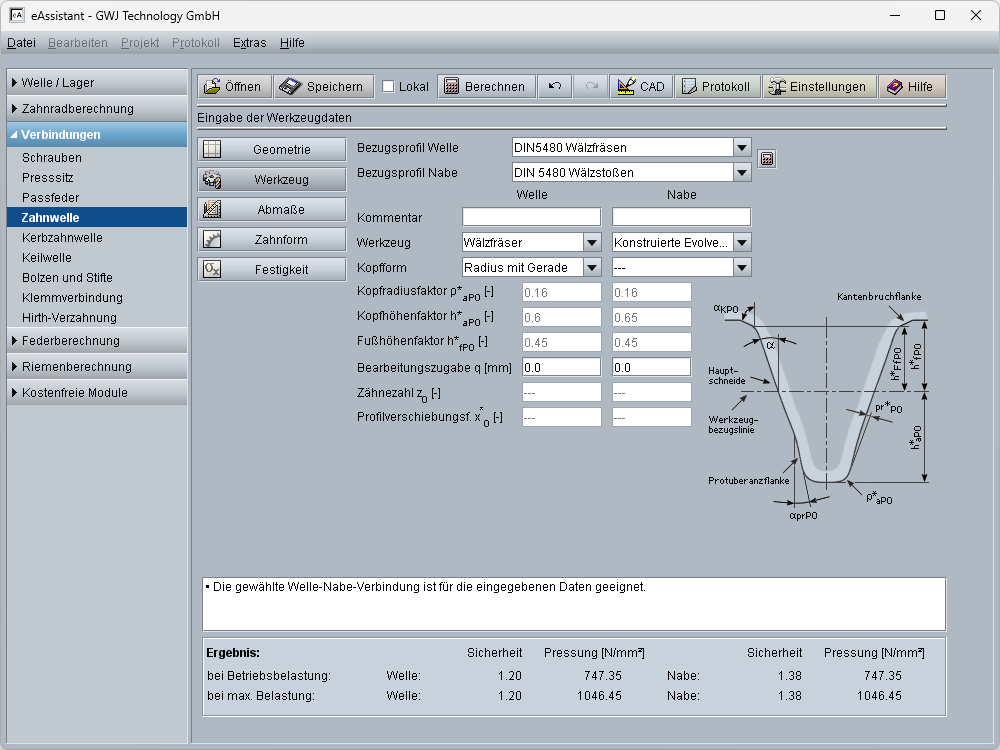 - Werkzeugbezugsprofile nach DIN 5480 für Räumen, Wälzfräsen, Wälzstoßen und Kaltwalzen sowie für Durchmesserzentrierung sind auswählbar oder können individuell vorgegeben bzw. ausgelegt werden