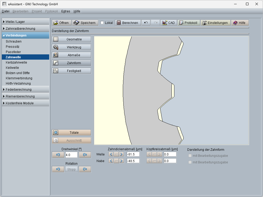 Zur Festlegung der Toleranzen können die Verzahnungsqualität und die Abmaßreihe nach DIN 5480, DIN 5482, ANSI B92.2 und ANSI B92.1 aus entsprechenden Auswahllisten gewählt werden. Damit werden die zulässigen Abweichungen und die Zahndickenabmaße automatisch ermittelt. Die Ermittlung der Zahndickenabmaße kann auch aus gemessenen Werten bzw. aus vorgegebenen Prüfmaßen erfolgen. Die Prüfmaße für die Verzahnung sowie das Normal- und Verdrehflankenspiel werden ebenfalls mit berechnet. Für die Prüfmaße werden die empfohlene Messzähnezahl und der Kugel- bzw. Rollendurchmesser vorgeschlagen und können individuell angepasst werden. Weiterhin ist die Darstellung der exakt berechneten Zahnform möglich. Diese kann im 2D-DXF ausgegeben oder über die eAssistant CAD-PlugIns in verschiedenen CAD-Systemen als 3D-Modell generiert werden. Dabei werden auch die Zahndickentoleranzen mit berücksichtigt, so dass die Zahnform auch für die Fertigung, z.B. mittels Fräsen, Laserschneiden oder Drahterodieren, weiterverwendet werden kann.