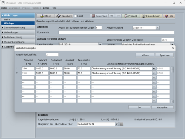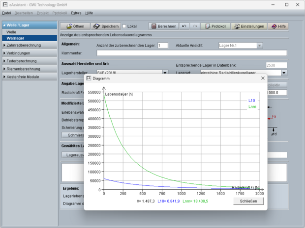 Als Berechnungsergebnisse werden sofort die nominelle Lebensdauer, die erweiterte Lebensdauer sowie die statische Kennzahl angezeigt. Zusätzlich stehen verschiedene Diagrammdarstellungen zur Verfügung: