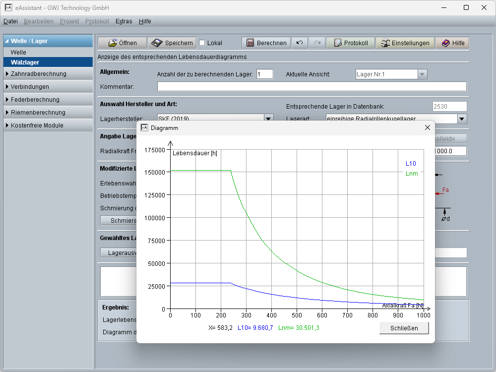 - Berechnungsergebnisse zusätzlich mit Diagrammen, z. B. Lebensdauer über Axialkraft