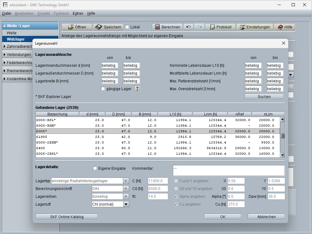 bereichsweise vorgegeben werden. Neben der Auswahl von Lagern aus der Wälzlagerdatenbank können auch Lager selbst eingegeben und berechnet werden.